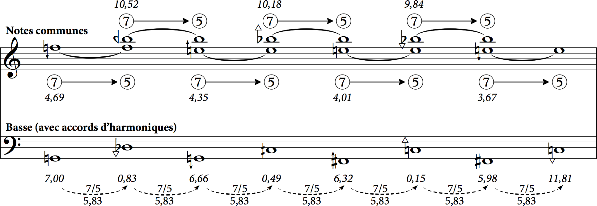 Haas’s music has integrated lessons in cueing from open-form pieces like in iij. Noct., which means that the narrator is not bound to a strict timeline, but that the ensemble can move on or repeat segments to synchronize with the pace of the spoken text. The result is a score which is primarily linear, but with some ossia passages allowing flexibility. The harmonic motion is summarized in Figure 6, which shows how common tones in the upper voices regulate the just-intonation intervals from one bass note to the next, each with its own overtone-series chord.16 Even though the intervals between bass notes invoke complex ratios and unfamiliar microtonal intervals, the progression is closed: it ends near where it began, just a perfect fifth away. The final A-flat (7.02 semitones from the initiating C-sharp) is essentially back in equal temperament, and becomes the bottom pitch of a low-register chromatic cluster in the following section.